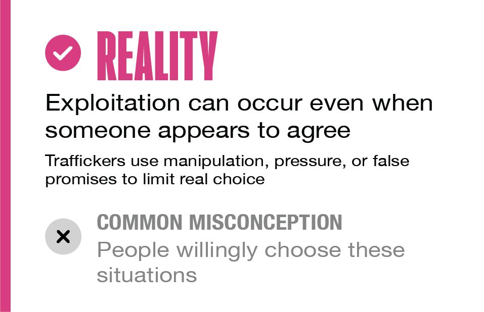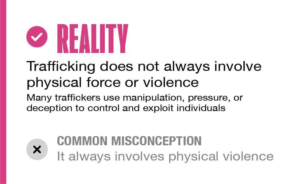 It does not require movement or crossing borders and can happen in any community. It often involves manipulation, pressure, or abuse of vulnerability rather than physical restraint. For individuals under 18, any commercial sexual exploitation is considered human trafficking, regardless of whether force, fraud, or coercion is present.